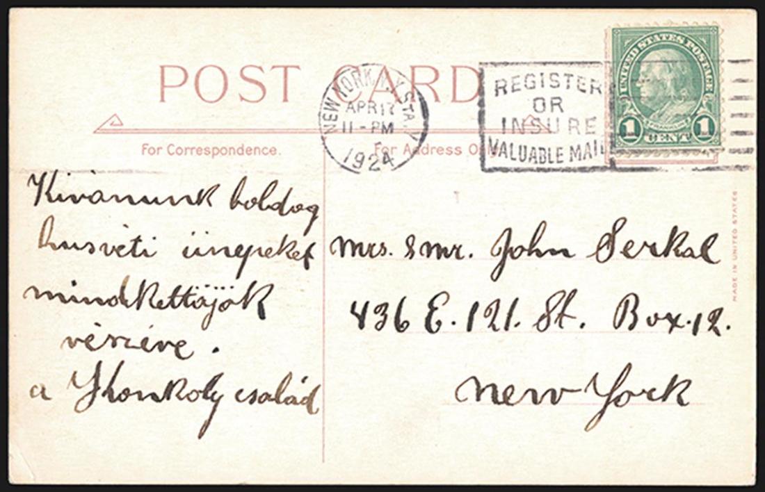 The 1923 One Cent Green Coil Waste stamp is not only one of the rarest stamps in 20th century philately, with fewer than 100 confirmed examples, but it also is widely regarded as one of the most difficult of all U.S. issues to find in any kind of premium condition. Virtually every example one encounters is terribly off center, with its perforations cutting the design on at least one side and, invariably, most have flaws ranging from minor to severe. Whenever a true gem example appears at auction it always commands substantial premiums over its catalog value and attracts considerable bidder excitement. In addition to being a highly desirable and sought-after stamp off cover, the One Cent Green Coil Waste on cover is a great rarity, as only four covers are known bearing this stamp. Two are postcards, each bearing a single stamp and both are used from New York City in 1924. There is a pair on an envelope, also used from New York City in 1924, but the perforations on the pair cut the design, and there is a single franking on an envelope from New York paying the unsealed circular rate.