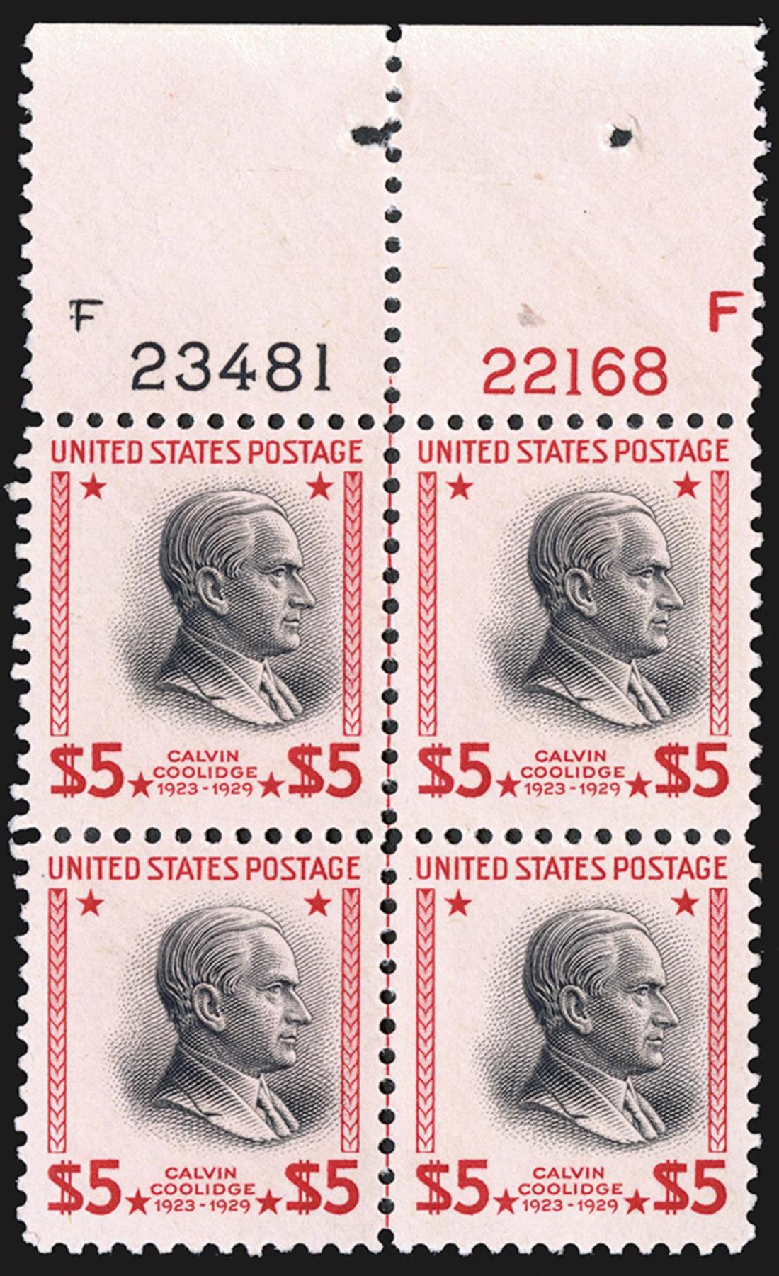 #834, $5.00 Carmine and black, top margin plate nos. 23481, 22168 block of four showing vignette shifted to the right, o.g., n.h., very fine.