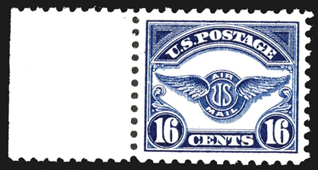 #C5, 16c Dark blue, a fantastic left sheet margin single, extraordinarily well centered amid generous equal margins, o.g., n.h., an extremely fine gem; 1987 PF certificate for the pair from which this was taken and 2016 PSE certificate (Superb 98; SMQ $1,350.00).