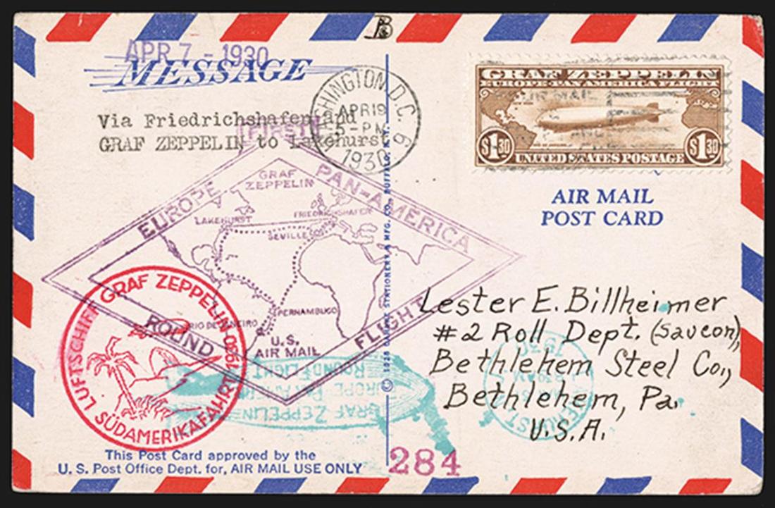 #C14, $1.30 Graf Zeppelin, well centered single cancelled by "Washington, D.C./Apr 19, 1930" first day of issue slogan machine cancel on flown air mail post card showing air mail routes throughout the U.S., appropriate violet U.S. and red German flight cachets and green Lakehurst Graf Zeppelin round flight arrival cancel, very fine.