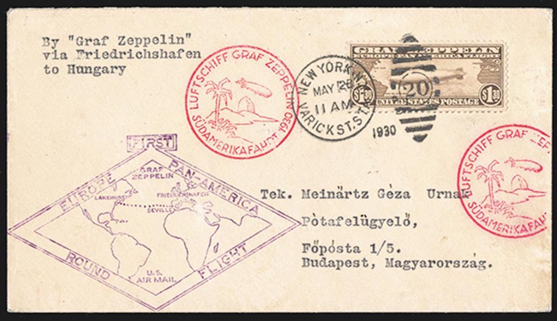 #C13-14, 65c and $1.30 Graf Zeppelins, tied to flown card and cover respectively addressed to Hungary, appropriate violet U.S. and red German flight cachets and arrival backstamps, very fine.