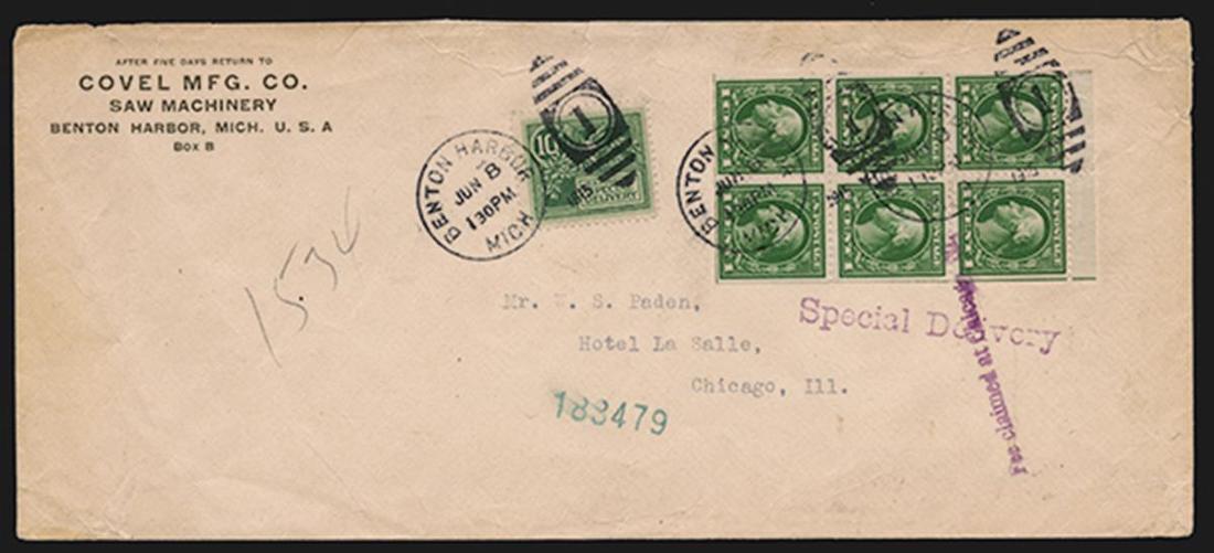 #E7, 10c Green, fine single tied by "Benton Harbor, Mich/Jun 8, 1915" duplex postmark and used along with well centered 1c Green booklet pane of six (#374a) to pay the triple rate to Chicago, legal sized cover with Covel corner card, backstamped upon arrival, cover with small opening tears at top, fine and rare combination franking;