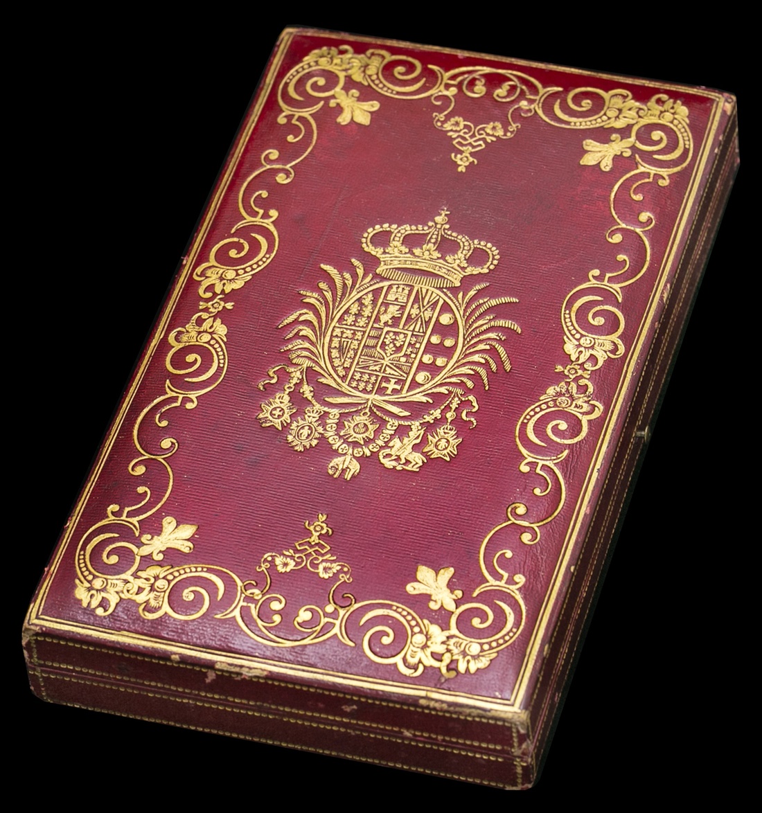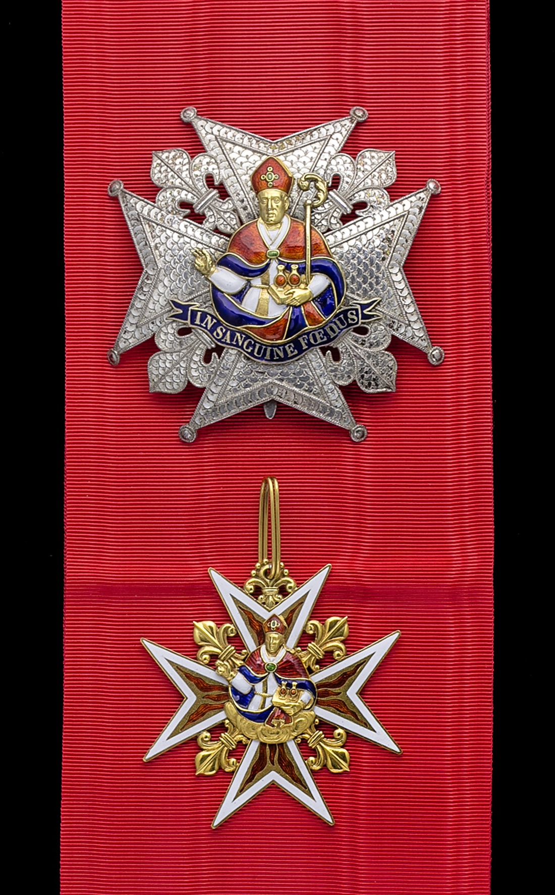 (x) Italy, Kingdom of the Two Sicilies, Order of St. Januarius, Knight's set of Insignia, sash Badge, 62mm, gold and enamel; Star, 80mm, gold, silver and enamel, import marks to retaining pin and clip, two Star tips slightly bent due, otherwise nearly extremely fine and rare, with full length of sash riband, in the original red morocco and finely gold blocked case of issue (2)