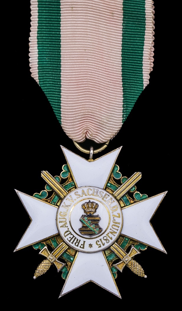 Germany, Saxony, Order of Civil Merit, 2nd type, Knight First Class breast Badge, with Swords, 35mm, silver-gilt and enamel, the central enamel medallion marginally loose, otherwise nearly extremely fine