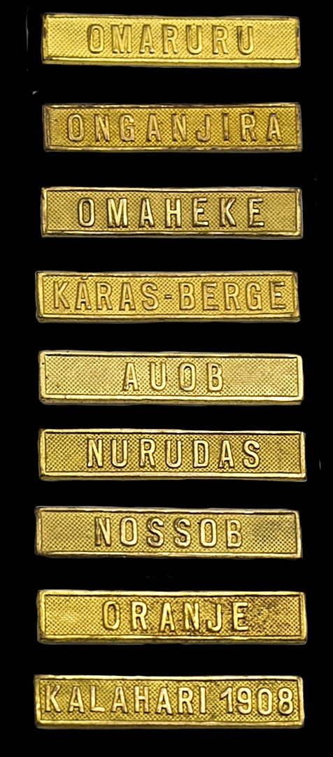 Germany, Kingdom, Clasps to the South Africa Campaign Medal (10), Auob; Kalahari 1908 (2); Karas-Berge; Nossob; Nurudas; Omaheke; Omaruru; Onganjira; Oranje, gilt, generally very fine or better, prepared for display purposes (10)