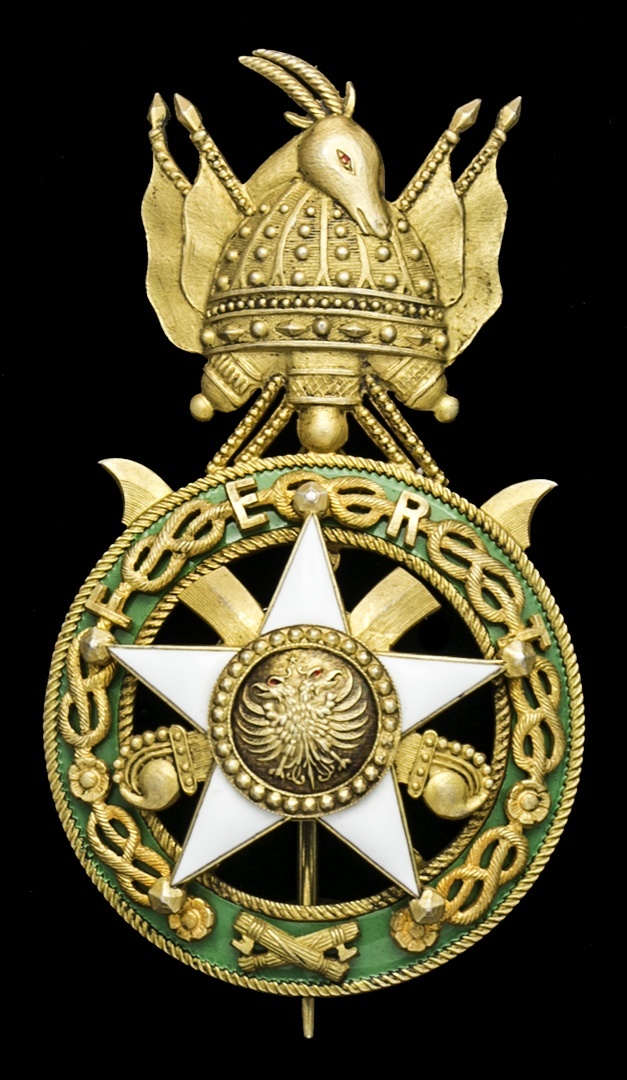 (x) Albania, Kingdom, Order of Scanderbeg, 2nd type under Italian Occupation, Commander´s pin-back breast Badge, by Cravanzola, Rome, 85mm including crown suspension x 47mm, silver-gilt and enamel, ´F.E.R.T.´ around centre, maker´s cartouche and silver marks on reverse, the central medallion a little loose, extremely fine