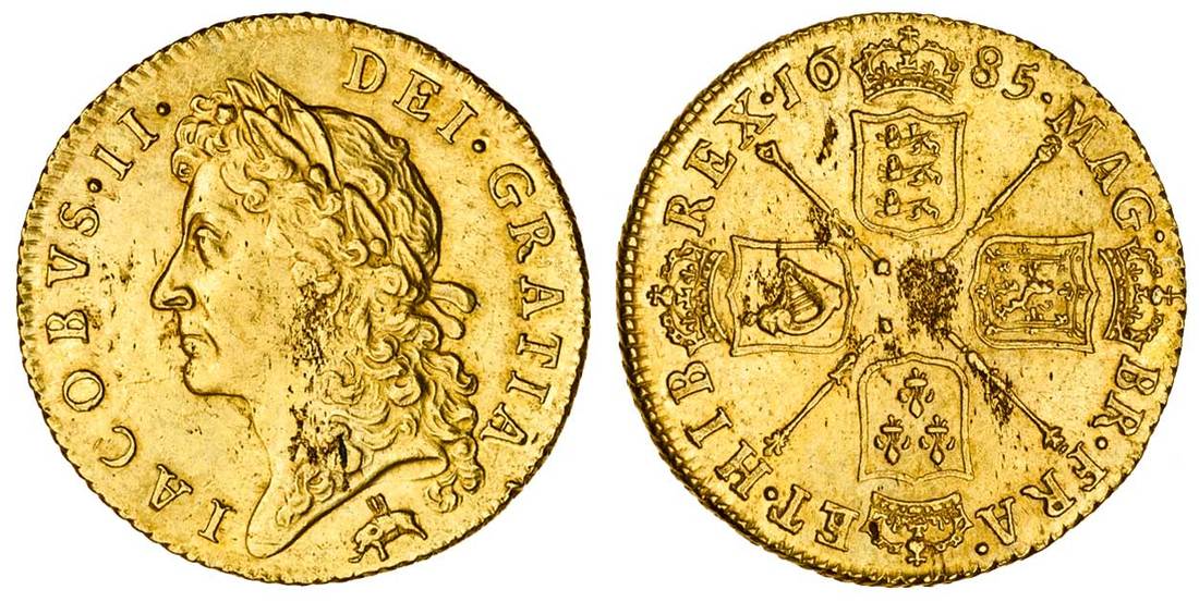 James II (1685-88), Guinea, 1685, first bust left, elephant and castle below, rev. four crowned shields cruciform, sceptres in angles (MCE 124; S.3401), metal flaws both sides, otherwise extremely fine and with some lustre
