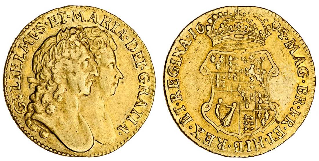 William and Mary (1688-94), Guinea, 1694 over 3, conjoined busts right, rev. crowned shield (MCE 159 var. - the overdate not noted, though it is noted for the 1694 elephant and castle; S.3426), very fine, some lustre, rare