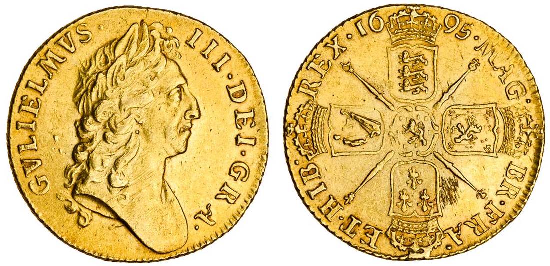 William III (1694-1702), Guinea, 1695, first laureate bust right, rev.four crowned shields cruciform, sceptres in angles (MCE 174; S.3458), adjustment marks, good very fine