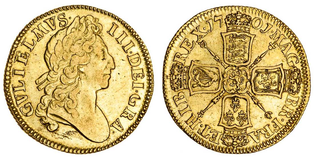 William III (1694-1702), Guinea, 1701, second laureate bust right, rev. four crowned shields cruciform, with human-headed harp (MCE 186; S.3463), about very fine
