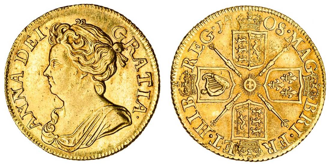 Anne (1702-14), post-Union Guinea, 1708, second draped bust left, rev. four crowned shields cruciform, sceptres in angles (MCE 218; S.3572), attractive and lustrous, good very fine