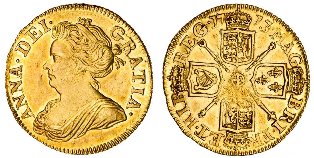 Anne (1702-14), post-Union Half-Guinea, 1713, draped bust left, rev. four crowned shields cruciform, sceptres in angles (MCE 236; S.3575), about extremely fine with some lustre