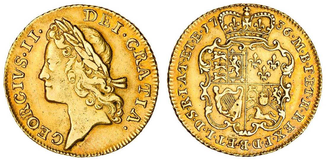 George II (1727-60), Guinea, 1736, second young laureate head left, larger lettering, rev. crowned shield (MCE 312; S.3674), very fine with a light red tone