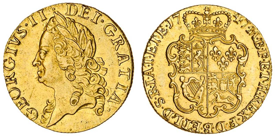 George II (1727-60), Guinea, 1747, old laureate head left, rev. crowned shield (MCE 322; S.3680), brushed, good very fine