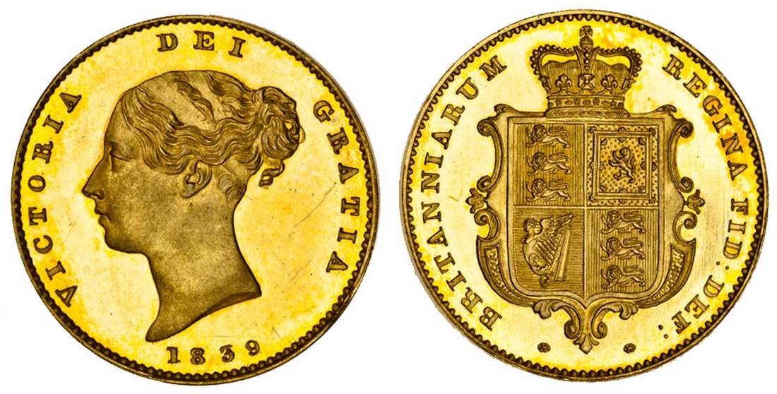 Victoria (1837-1901), proof Half-Sovereign, 1839, struck en médaille, young head left, date below, rev. crowned shield, edge plain (WR 343; S.3859), two light scratches behind head, otherwise some light hairlines, almost uncirculated, very rare