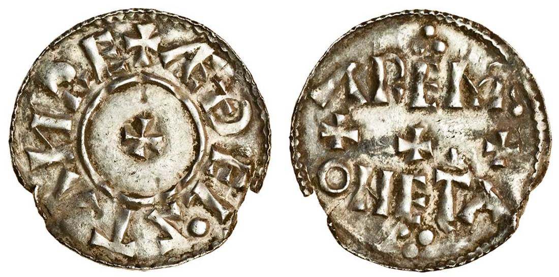 Aethelstan (924-939), Penny, 1.45g, Two Line type (HT1), North-Eastern I, Are, +aeÐelstan re, pellet between l-s, small cross patteé, rev. three crosses dividing are m / oneta trefoil above, inverted trefoil below (Blunt 380 same reverse die; N.668B; S.1089), large flan as usual but with edge damage in two places, very fine, scarce