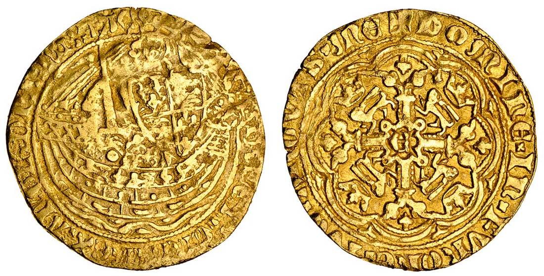 Edward III (13277-77), fourth coinage, treaty period, 1361-69, transitional series, 1361-61, Half-Noble, 3.44g, London, m.m. cross potent, [ed] dei gra rex angl dns hib acq, king standing in ship, holding sword and shield, rev. domine ne in fvrore tvo argvas me, lombardic m and n, saltire stops (Schneider-; N.1223; S.1500), fine, very rare variety with Acquitanian title