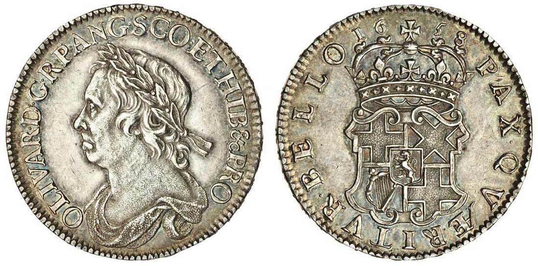 Cromwell, Halfcrown, 1658, laureate and draped bust left, rev. crowned shield, 1658 HIB type legend, lettered edge (ESC 447; S.3227A), somewhat scuffed and the high points of the portrait a little weak, otherwise good very fine, well-struck and lightly toned, some lustre