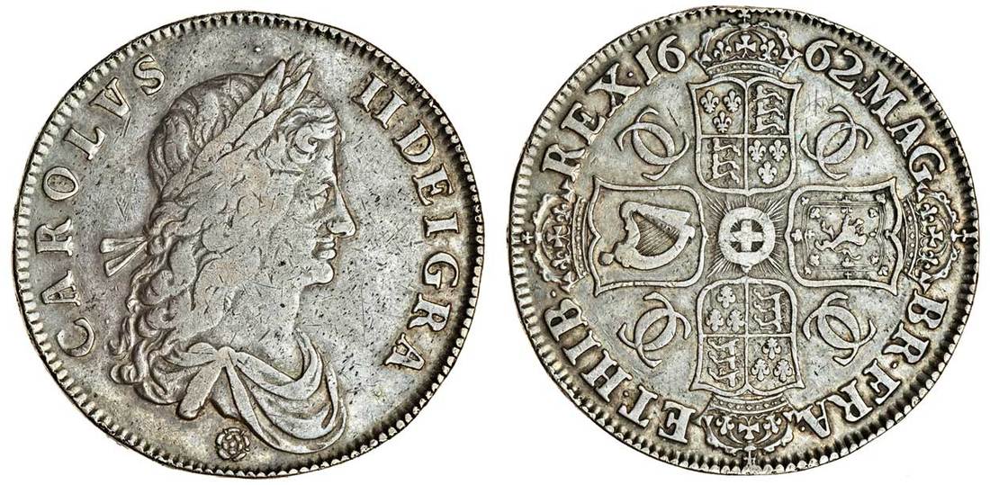 Charles II (1660-85), Crown, 1662, laureate and draped bust right, rose below, rev. four crowned shields cruciform, die axis inverted (ESC 15; S.3350), fine