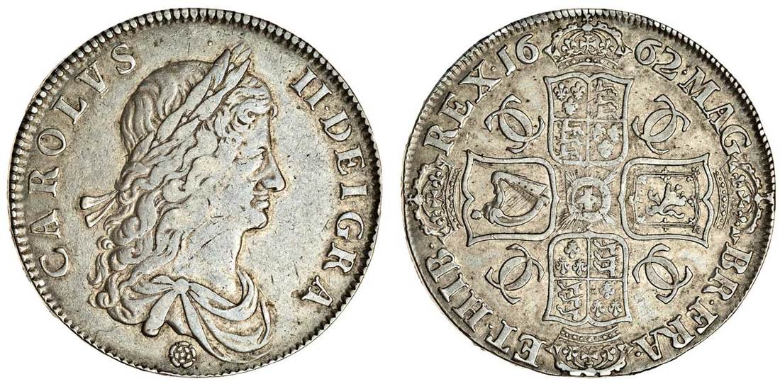 Charles II (1660-85), Crown, 1662, laureate and draped bust right, rose below, rev. four crowned shields cruciform, die axis upright (ESC 15; S.3350A), good fine