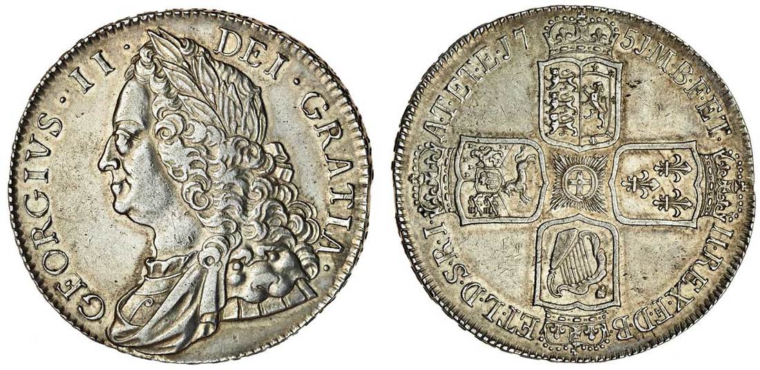 George II (1727-60), Crown, 1751, v. qvarto, old laureate and draped bust left, rev. crowned shields cruciform, plain angles (ESC 128; S.3690), cleaned, good very fine