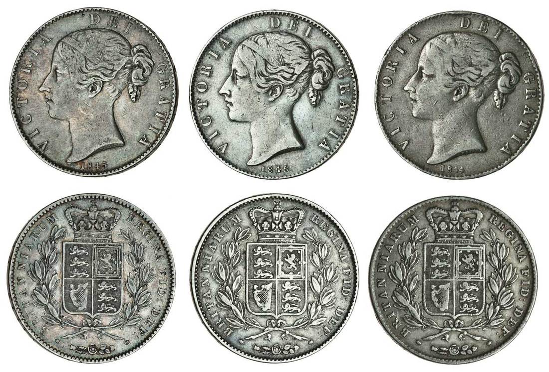 Victoria (1837-1901), Crowns (3), 1844 VIII, star stops, 1845 VIII (2), cinquefoil stops, young head left (ESC 280, 282; S.3882), fine to very fine (3)