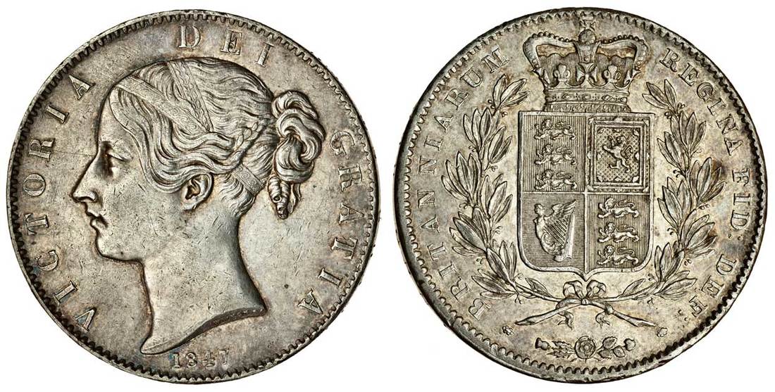 Victoria (1837-1901), Crown, 1847, XI, young head left, rev. crowned shield, cinquefoil stops (ESC 286; S.3882), good very fine