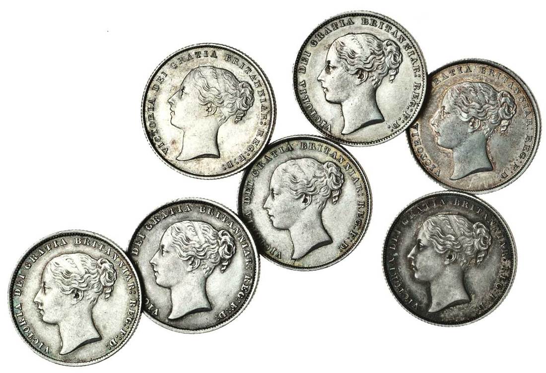 Victoria (1837-1901), Shillings (7), 1839, 1846, 1853, 1858, 1859, 1860, 1861, second head left, rev. value within wreath (ESC 1280, 1293, 1300, 1306, 1307, 1308, 1309; S.3904), very fine and better (7)