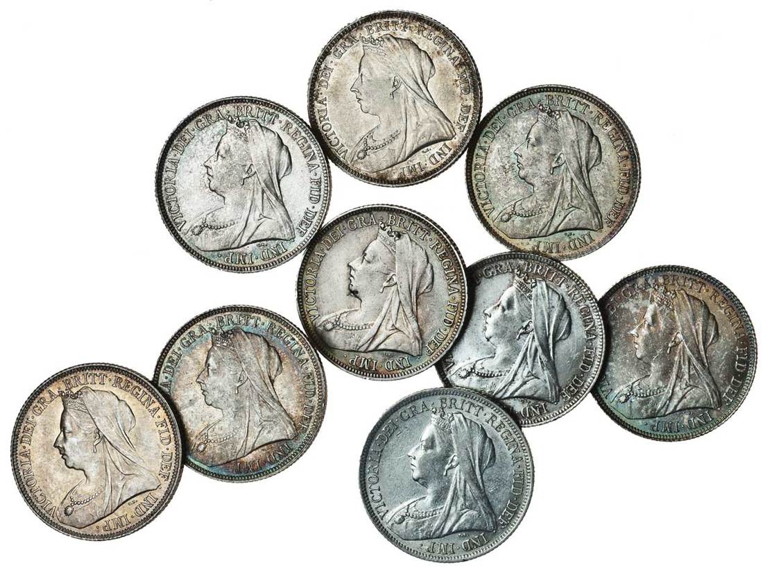 Victoria (1837-1901), Shillings (9), 1893 (2), 1894 (2), 1895 (2), 1898, 1900, 1901, old veiled bust left, rev. three shields within Garter, small rose (ESC 1361, 1363, 1364, 1367, 1369, 1370; S.3940, 3940A), extremely fine or better (9)