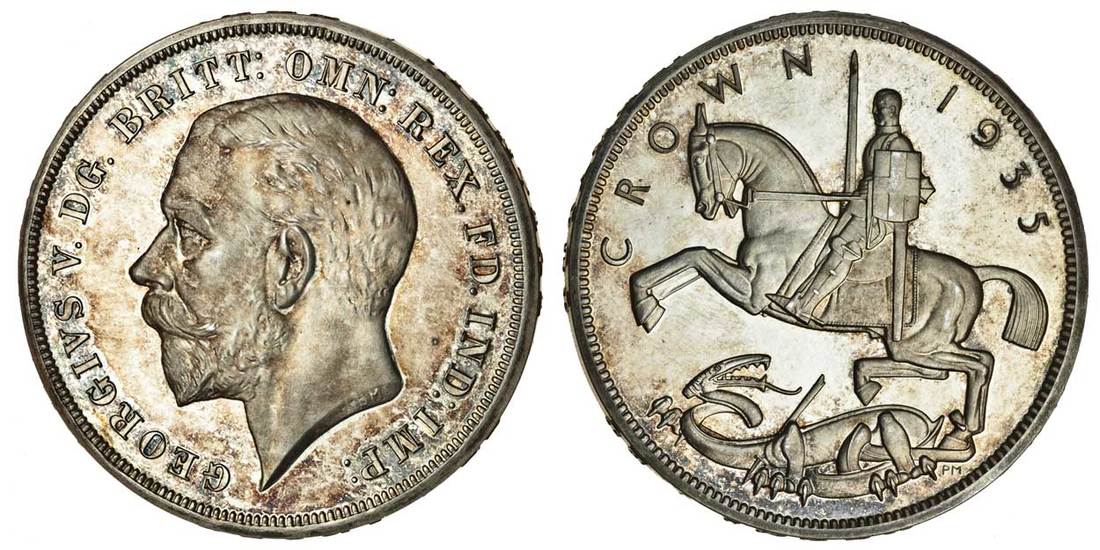 George V (1910-36), Proof Jubilee Crown, 1935, head left, rev. rev. St George, raised error edge decus anno regni et tutamen xxv (ESC 380 [R5]; S.4050), lightly toned, almost as stuck, very rare