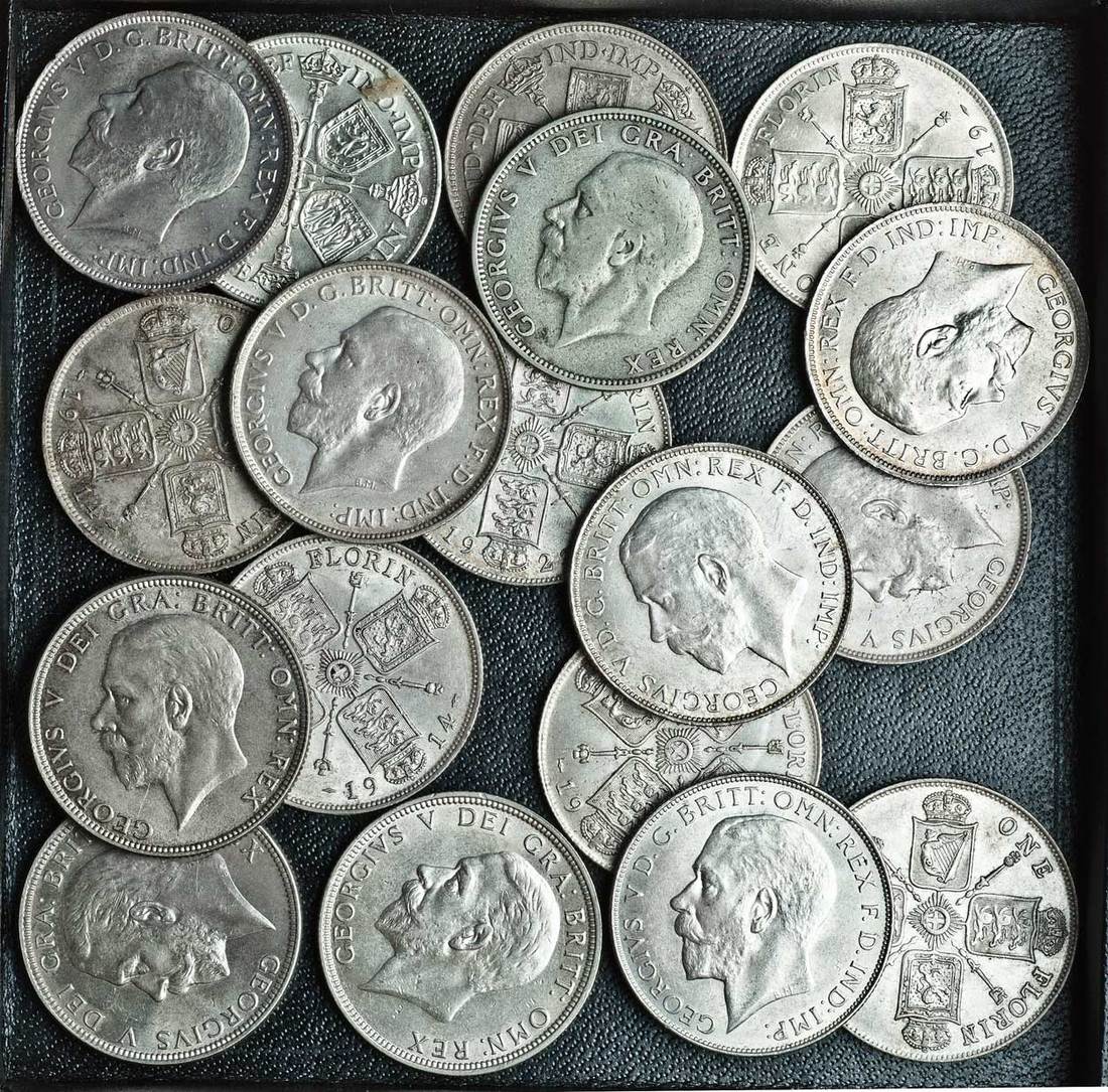George V (1910-36), Florins (19), 1914 (2), 1915, 1916 (2), 1917, 1918, 1919 (2), 1923 (2), 1926, 1930, 1931, 1932 (2), rare date, 1933 (2), 1835, bare head left, rev. crowned shields cruciform (S.4012, 4022A, 4038), mixed condition, both 1932 fine, average very fine to uncirculated (19)