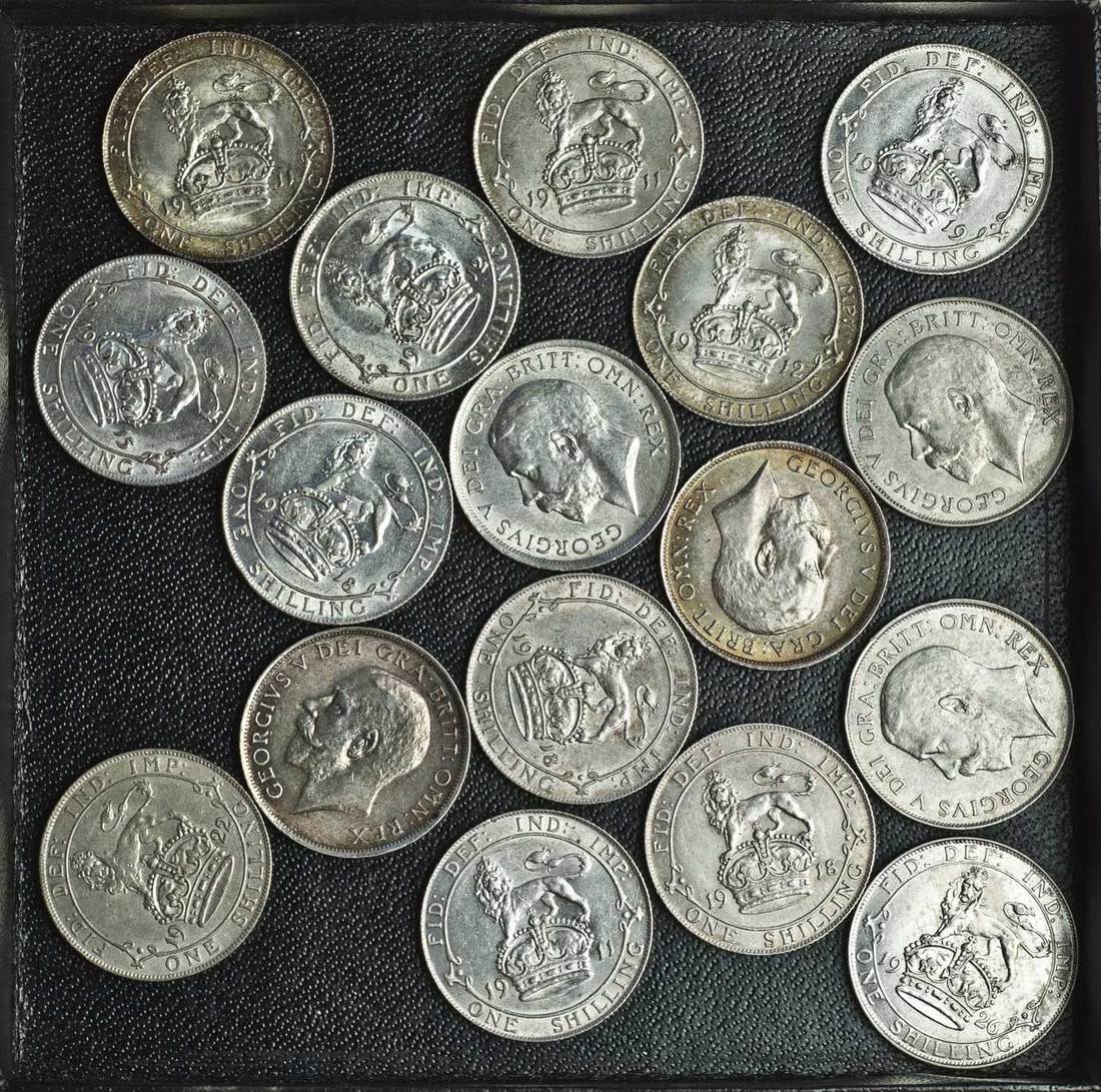 George V (1910-36), Shillings (17), 1911 (3), 1912 (2), 1913, 1914, 1915 (2), 1918 (3), 1919, 1922, 1924 (2), 1926, bare head left, rev. lion passant on crown (S.4013, 4023A), extremely fine or better (17)