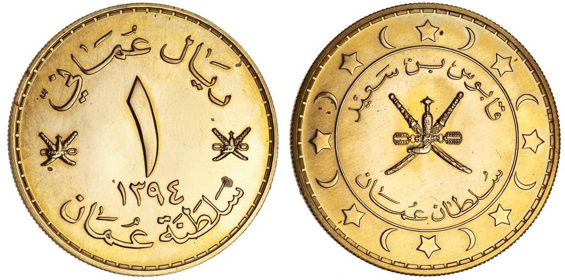 Oman, Qabus bin Sa'id (1970 - ), proof gold Omani-Rial, AH1394 (1974), in original red presentation box (KM 54), box with stained satin, coin lightly polished, otherwise as struck