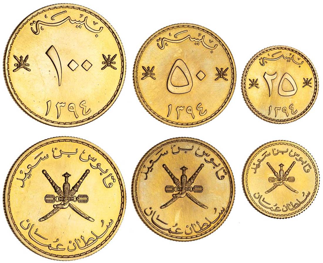 Oman, Qabus bin Sa'id (1970 - ), 1974 proof three-coin set, gold 100-, 50-, 25 Baisa, AH1394 (1974), in original red box of issue (KM PS1), box with stained satin, coins as struck (3)