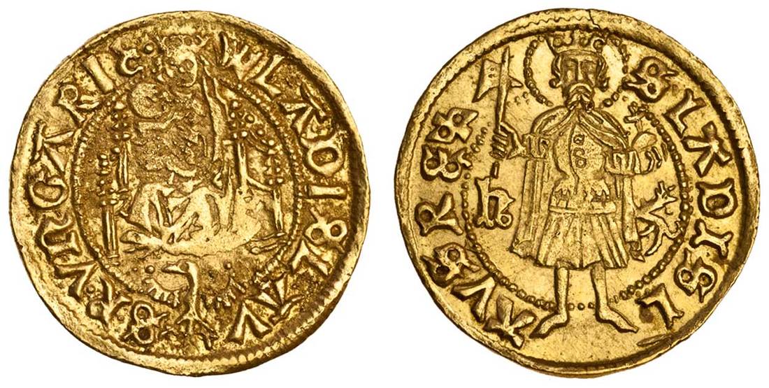 Hungary, Wladislaw II Jagello (1490-1516), Goldgulden (Ducat or Florin), 3.56g, undated, wladislav - s. r. vngarie., Madonna and Child seated on draped throne, legend divided by Polish eagle below, rev. s. ladisl - avs rex, saint standing, holding orb and axe, h to left, dog to right (F.32; HCz.7048 - R4; Huszár 761), rusty obverse die, extremely fine