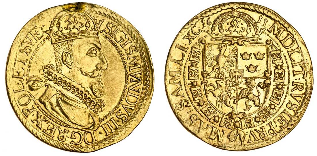 Poland, Sigismund III Vasa (1587-1632), 5-Ducats (Half Portugaloeser), 17.37g, 1611, sigismvndvs. iii. gd. rex. pol. et. sve., crowned and draped bust right, wearing small ruff, rev. m. d. lit: rvsie. prv: mas: sam: li: xc., crowned shield, date either side of crown (F.78; H.CZ.1273 - R6), smooth edges from a mount, and mark where removed at 12 o'clock, otherwise good very fine, very rare