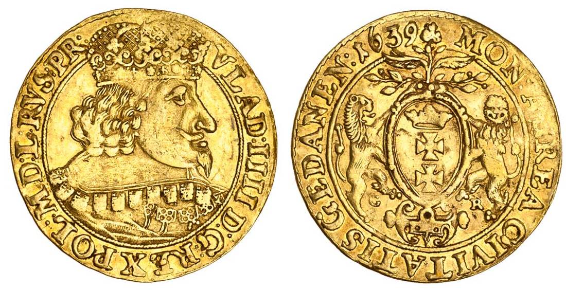 Poland, Wladislaw IV Vasa (1632-48), Ducat, 3.49g, 1639, Gdansk (Danzig), vlad: iiii d: g: rex pol: md: l: rvs: pr:, crowned and draped bust right, wearing falling lace collar, rev. mon avrea: civitatis gedanen; city arms with supporters, g-r (for moneyer Gerhard Rogge) below (F.15; H.Cz.1801 - R2), weak at 12 o'clock (from a mount?), very fine