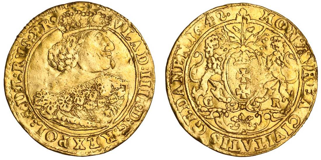 Poland, Wladislaw IV Vasa (1632-48), Ducat, 3.38g, 1642, Gdansk (Danzig), vlad: iiii: d: g: rex pol: m: d: l: rvs: pr., crowned and draped bust right, wearing falling lace collar, rev. mon: avrea civitatis gedanen, city arms with supporters, g-r (for moneyer Gerhard Rogge) below (F.15; H.Cz.9999 - R7), creased, mount removed, fine, rare
