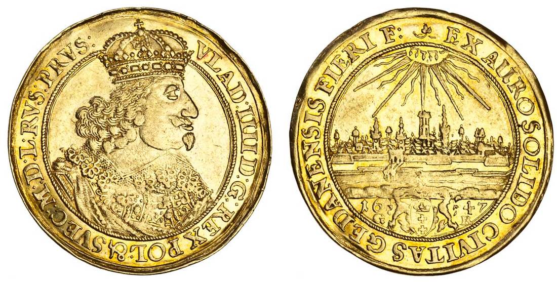 Poland, Wladislaw IV Vasa (1632-48), 2-Ducat, 6.96g, 1647, Gdansk (Danzig), vlad: iiii d: g: rex pol. & svec: m: d: l: rvs: prvs:, crowned and draped bust right, wearing falling lace collar, rev. ex auro solido civitas gedanensis fieri f, view of the city, name of Jehova in rays above, city shield with supporters below, dividing date and g-r (for Mint Master Gerhard Rogge) (F.21a; H.Cz.1866 - R2), good very fine and lustrous, with attractive golden tone, rare
