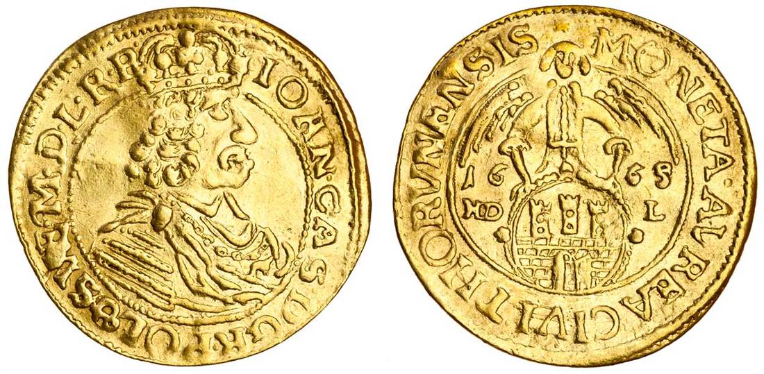 Poland, John II Casimir (1648-68), 2-Ducats, 6.82g, 1665, Thorn, iohan. cas d g r. pol & sve. m. d. l. r. p., crowned, draped and cuirassed bust right, rev. moneta. avrea civi. thorvnensis, angel above city shield dividing date and hd-l below (F.59; H.Cz.2291 - R4), wavy flan, good very fine