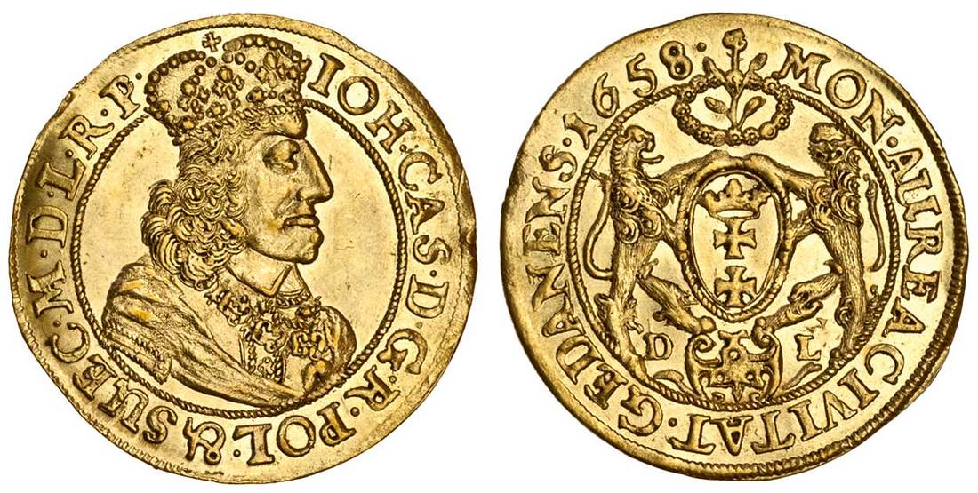 Poland, John II Casimir (1648-68), Ducat, 3.50g, 1658, Gdansk (Danzig), ioh. cas. d. g. r. pol. & suec. m. d. l. r. p., crowned, draped and cuirassed bust right, rev. mon. aurea civitat. gedanens. city shield with supporters dividing d-l below (F.24; H.Cz.2129 - R), pinched on edge (from an old mount?), extremely fine