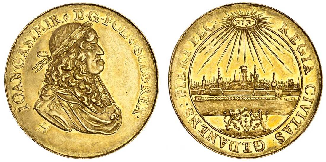 Poland, John II Casimir (1648-68), 3-Ducats Donative, 10.42g, undated, Gdansk (Danzig), ioan. casimir, d. g. pol. & suec. rex., laureate, draped and cuirassed bust right, signed with monogram jh below (for Jan Höhn), rev. regia civitas gedanens; fieri fec., view of the city, name of Jehova in rays above, city shield with supporters below (H.Cz.2341 - R2), extremely fine, rare