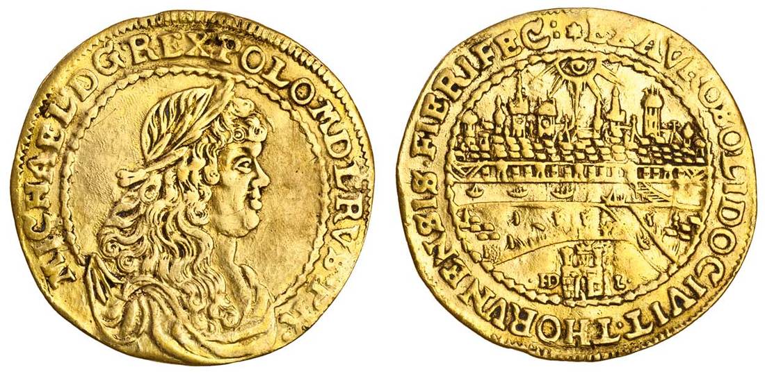 Poland, Michael I Korybut (1669-73), 2-Ducats, 6.66g, undated, Thorn, michael. d g. rex. polo. mdl rvs. pr., laureate and draped bust right, rev. ex avreo solido civit. thorvnensis. fieri fec:, view of the city, Eye of Providence in rays above, tower dividing hd-l below (F.66; H.Cz.2397 - R3), probably from a mount, very fine