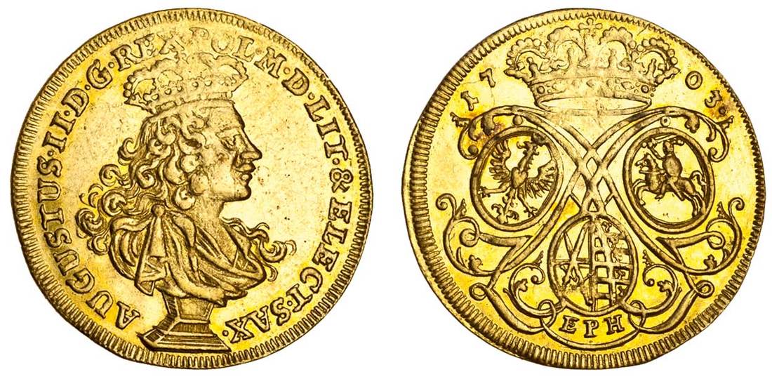 Poland, Friedrich August I (Augustus II) (1697-1733), Ducat, 3.47g, 1703, struck at Leipzig, augustus. ii. d. g. rex. pol. m. d. lit. & elect. sax., crowned and draped bust on pedestal right, rev. crowned shields of Saxony, Poland and Lithuania (F.2813 (Saxony); H.CZ.2627 -R5), mount removed at 12 o'clock, good very fine