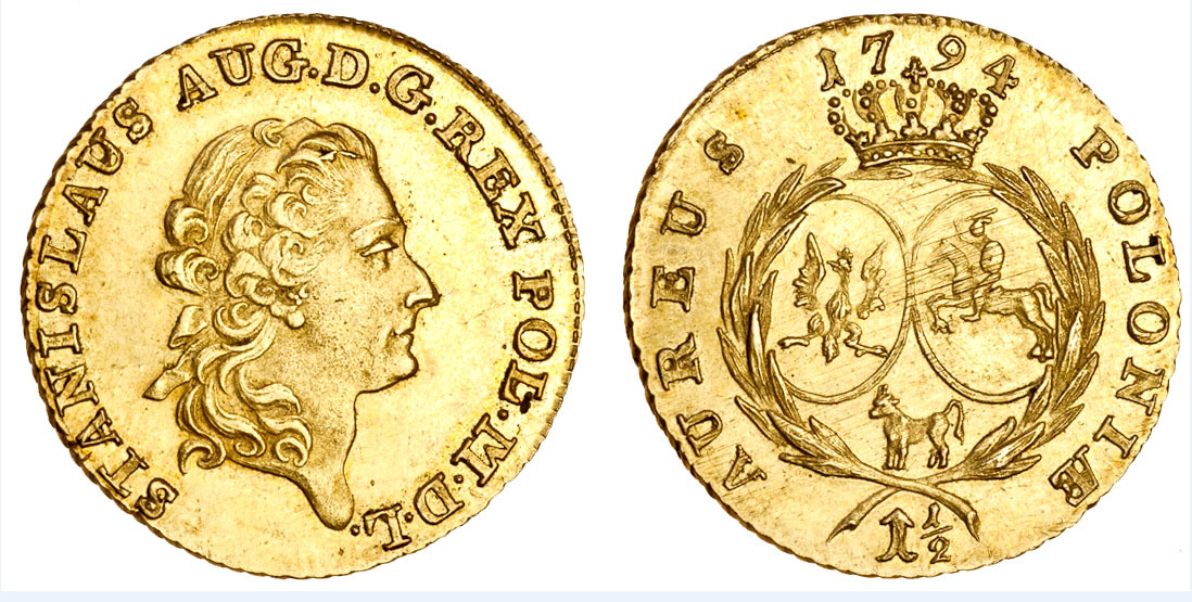 Poland, Stanislaus Augustus Poniatowski (1764-95), One and a Half-Ducats, 6.17g, 1794, Warsaw, laureate head right, rev. crowned shields in wreath, value below (F.99; H.Cz.3365 - R), extremely fine