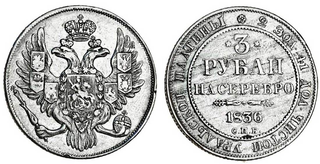 Russia, Nicholas I (1825-55), platinum 3-Roubles, 1836, 10.25g, St Petersburg, Imperial double-headed eagle, rev. value over date (Bitkin 82; F.160; Sev.619), very fine