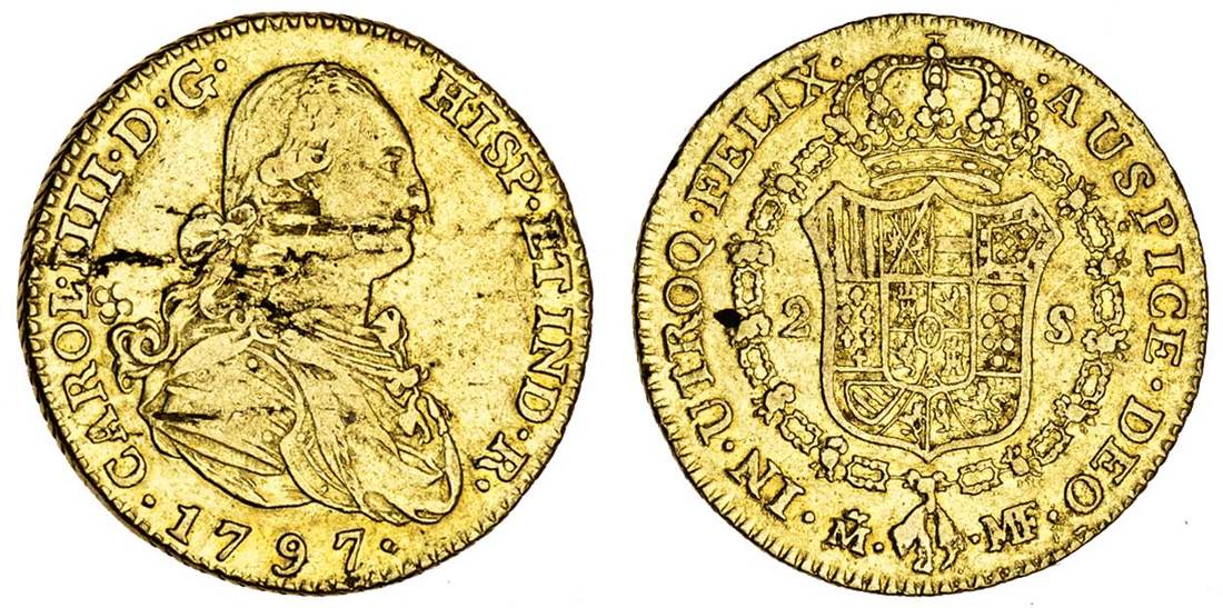 (x) Spain, Charles IV (1788-1808), Madrid, 2-Escudos, 1797 MF, bust right, rev. crowned shield (F.296; KM 435.1), metal flaws on obverse, very fine