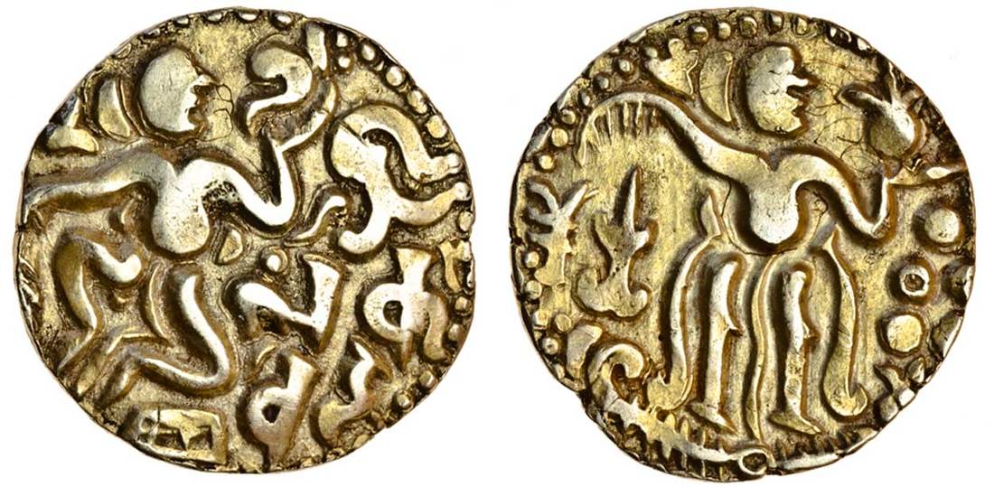 Sri Lanka, Anonymous (c.10th - 11th Century), AV Kahavanu, 4.33g., figure seated right, holding conch, legend Sri Lanka vibhu (Fortunate Lord of Sri Lanka) right, rev. standing figure holding lotus bud, symbols around (Codrington 54; MSI.II.312), good very fine
