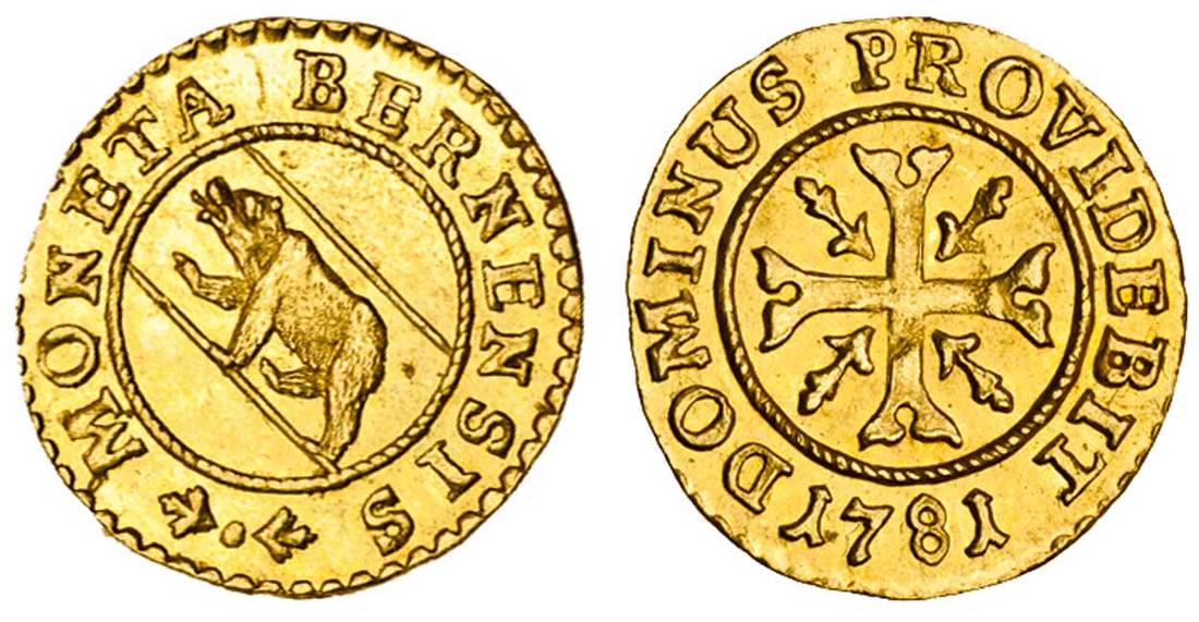 Switzerland, Bern, gold Vierer (goldabschläge), 1781, moneta bernensis, shield, rev. dominus providebit, cross (DT 533), extremely fine, rare