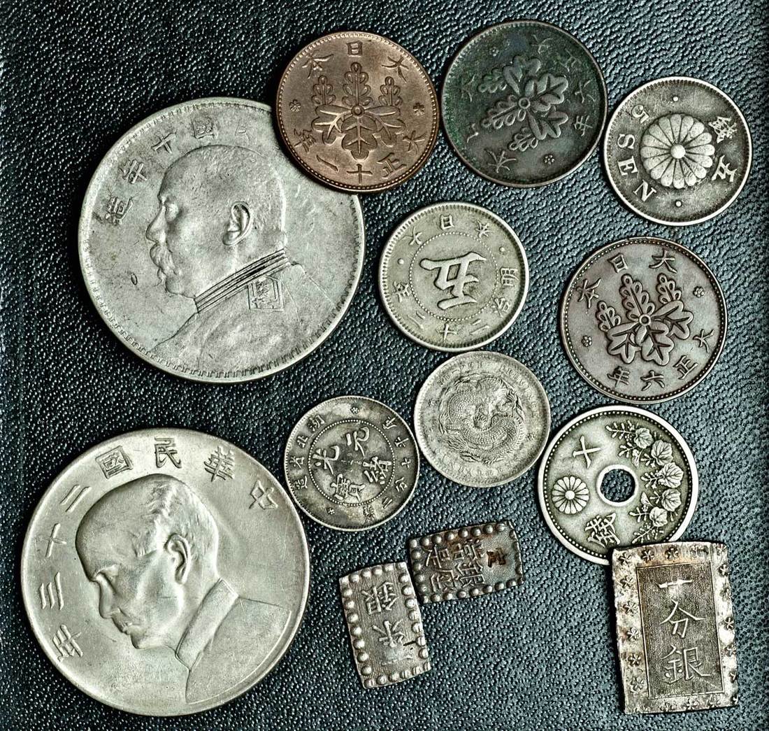 China, Japan, miscelleanous (13), including Sun Yat-Sen, Chinese 'Junk' Dollar, Year 23 (1934) (KM Y345; Kann 624; L&M 110), Yuan Shi-Kai, Dollar, Year 3 (1914) (Kann 645; KM 329), Japan, Ichibu, undated (1859-68), Ansei era (KM C16a), Isshu Gin (2), undated (1853-65), Kaei era (KM C12), average very fine (13)